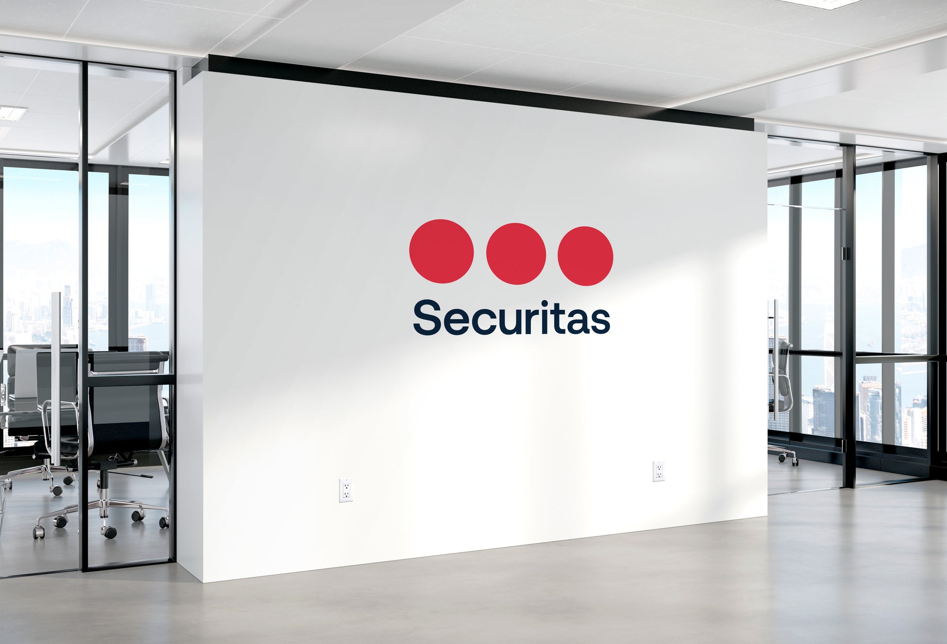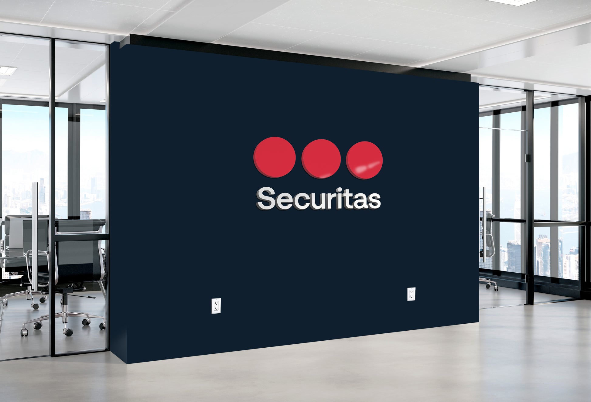 "Securitas" centerpiece wall logo. Produced as a printed flat vinyl with a matte finish or as a 1/2" gloss finished acrylic logo.